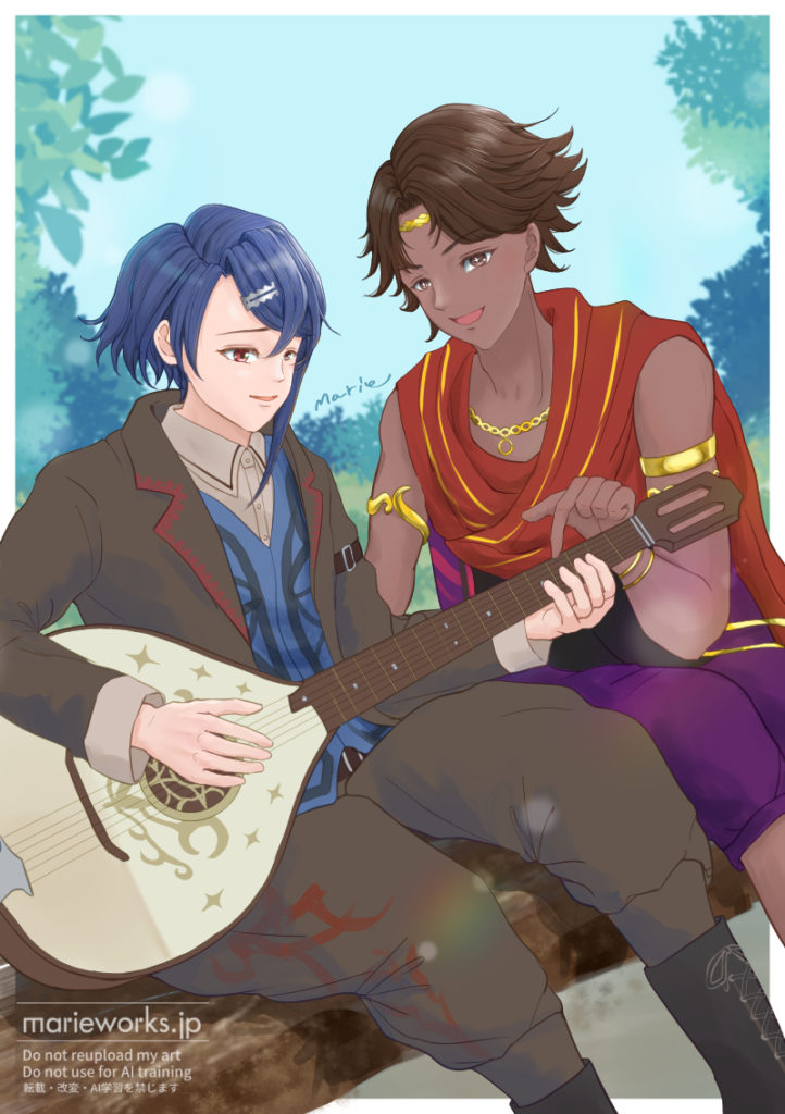- 2024.5.29 Galleryにらくがき1点追加。花婿スタくんの台詞「弦楽器はそれなりに扱えるのですが」で描きたくなったソルムの楽器をフォガに教わるスタくんです。