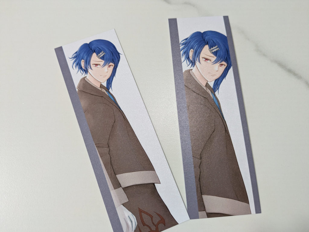 今回の表題作は「隠れる月(スタルーク)と照らし出す太陽(ディアマンド)」みたいなテーマだったので、そのイメージで「本の中に隠れるスタルークの栞」をつけたいなと思って一緒に刷りました。本の表紙はPP加工に合わせてシンプルな紙を選んだので、栞はキラキラ系のパールスノーペーパー(プラチナ)を使ってみました。写真だとわかりづらいですが細かい粒子のパール感でとてもかわいいです。画角決められなくて、同じ絵のトリミングとデザイン違いで2パターン刷りました。