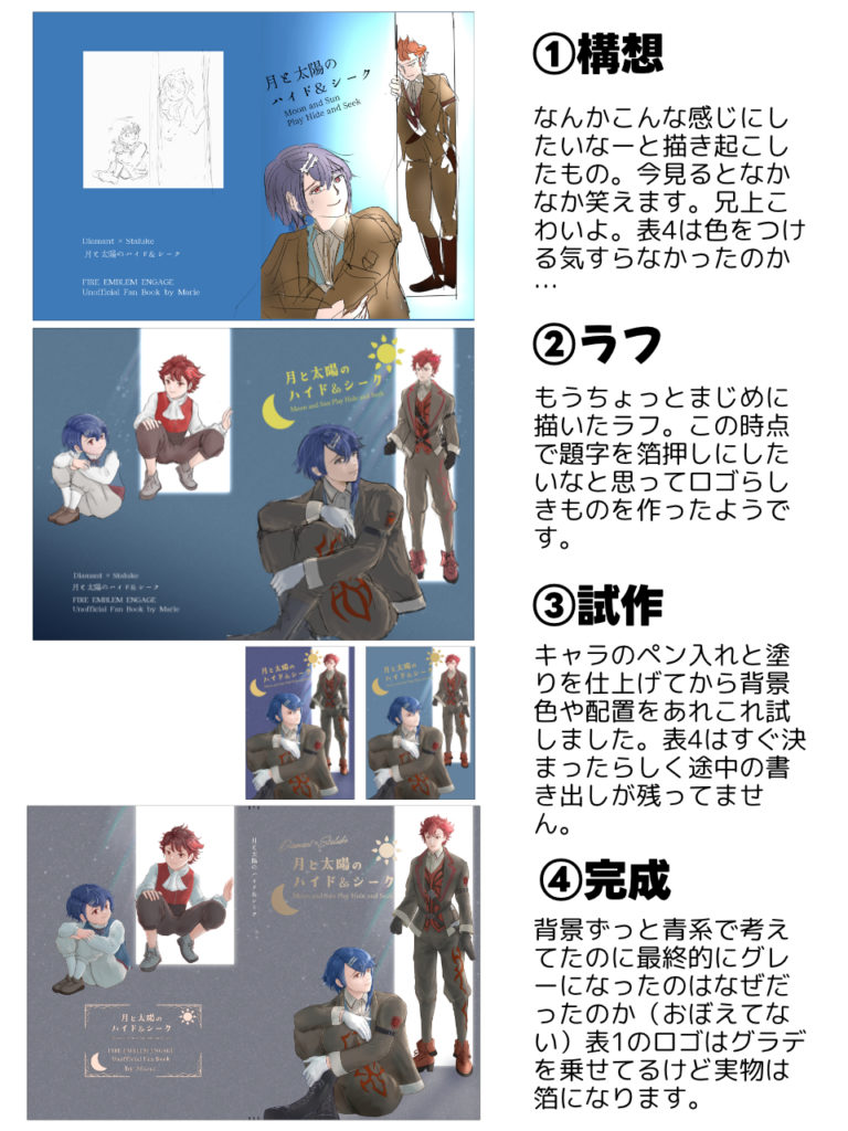 収録した小説(表題作)は、3月頃から書いていたようです。お話がだいたい書けてから口絵や表1表4用の絵を描きました。↓は後からラフを見返したら面白かったので作ってXとBlueskyにアップした「表紙デザインができるまで」まとめ画像です。