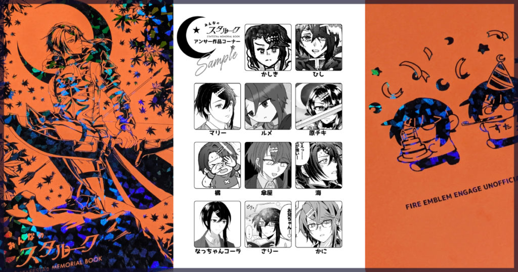 表紙と裏表紙には当初、キービジュアルを使おうと考えていたのですが、本の内容が出そろってくるにつれて、表紙でイベント色を前面に押し出すのは違うかなという気がしてきて、海さんとかにさんに新たに絵を描いていただきました。この時点で全面箔の表紙にしたいという気持ちがありまして、それを想定して描いていただいたものです。紙と箔の組み合わせは無限に迷って、海さんに相談させていただいて、ほかの方の作例画像をたくさん調べまくって候補を絞っていきました。最終的にケンラン(シュ)+オニキス箔という組み合わせにしましたよ。光の当たり方によってシックにも華やかにも見える、場面によっていろんな表情を見せるスタルークの魅力を体現したような装丁になったと思います。