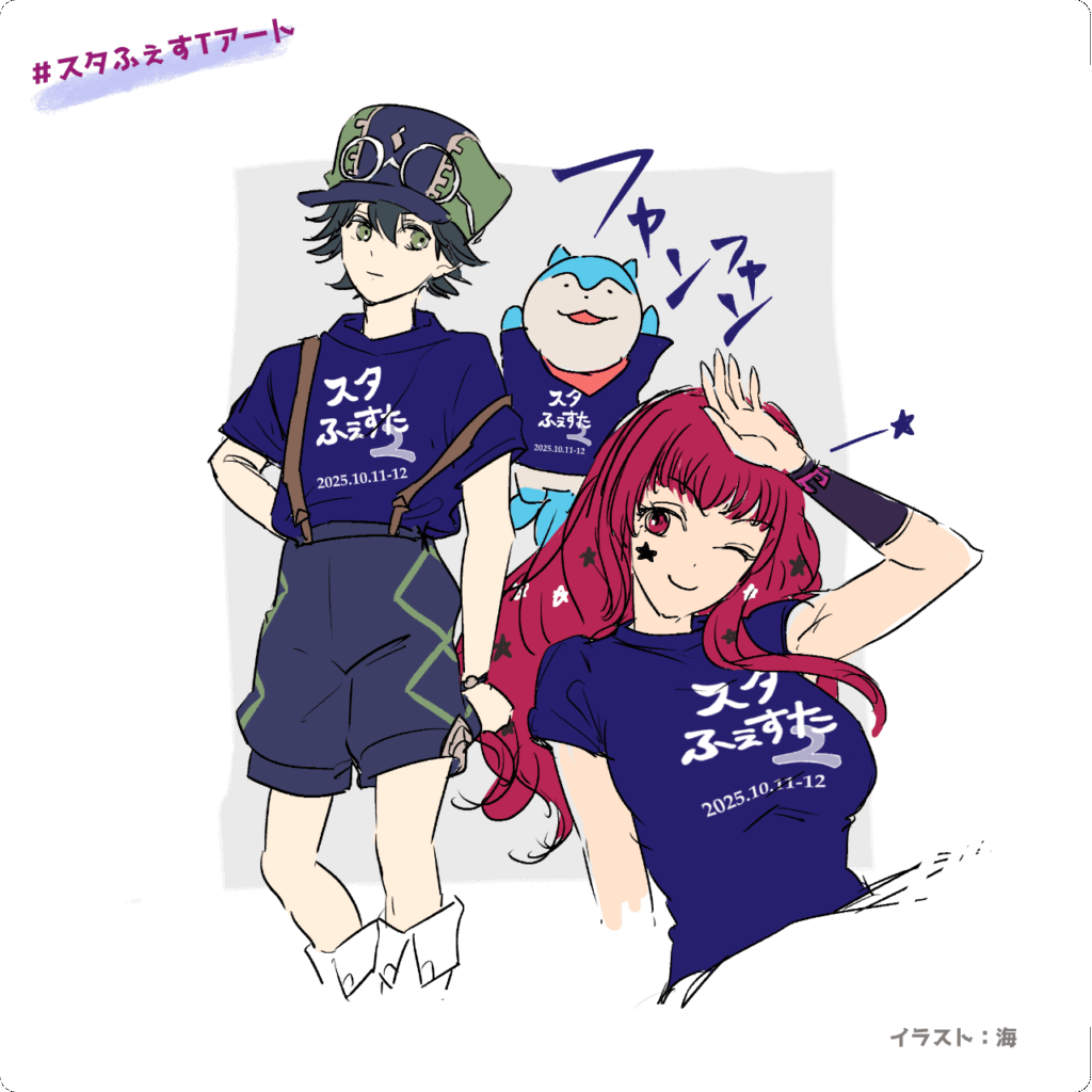 ふぇすTアート企画は、海さんがキービジュの邪スくんのラフを出してくれたとき、両サイドにふぇすT姿のジャンくんとユナカを描いてくださったのを拝見して、いろんなキャラにこのTシャツ着せたい!と思いついたものでした。当日のワンドロのお題にするのもありかなと思ったけど、こういうのは他の人が描いたのを見て自分も描いてみようかなと思う方が多いだろうし、イベントの宣伝にもなるだろうから、少し前から当日までの期間にするのが良いかなと考えてそうしました。