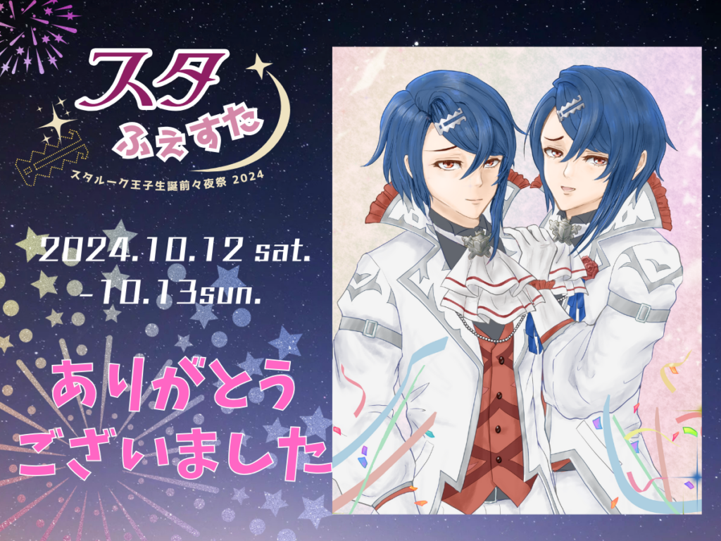 今回、初めてWebオンリーの主催をさせていただき課題や反省点もいろいろありますが、みなさまの「楽しかった」の言葉がとてもありがたくうれしく、やってみることにしてよかったなあとしみじみ思っております。なにより私自身、とても楽しかったです。スタふぇすた2回目もやれたら良いなあと思っているし、もう少し違うテーマのWebオンリーをやってみたい気持ちもあります。そのときはみなさままたなにとぞよろしくお願いいたします。